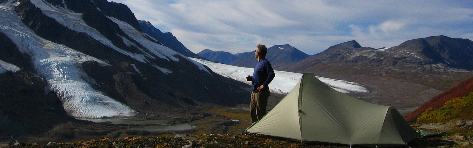 | Day 3 | On the third day we usually pack up and move our camp again. This time we head the other direction down the valley but on the opposite side. Down on the flats we enjoy the easy travel. But eventually we do have to earn our supper and do some uphill hiking to get to our lofty perch that will be our final campsite. The views from here are just stunning especially when the late afternoon light rakes the peaks and ice. This area makes for some great photos. The ridge has also been a good place for spotting bears in the past! |